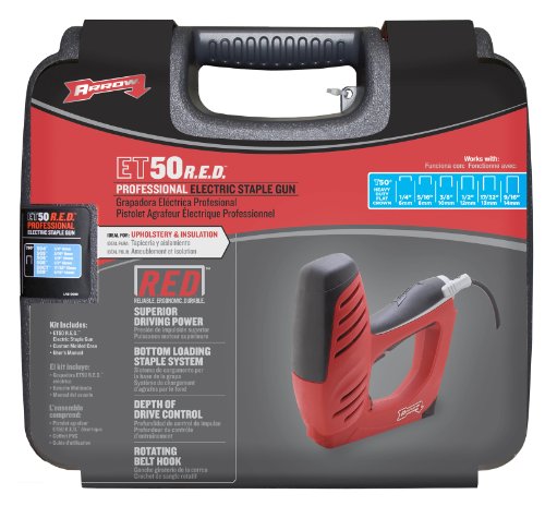 ET50RED Features: -Staple gun.-Electric.-High impact composite plastic.-Durable.-Electric firing technology.-Precision fastener control resists jams.-Bottom load.-Ergonomic soft rubber grip.-LED guide light.-Depth of drive control.you looking for super-cheap Arrow Fastener ET50RED Pro Electrical Staple Gun, Uses Six Sizes of T50 Staples?